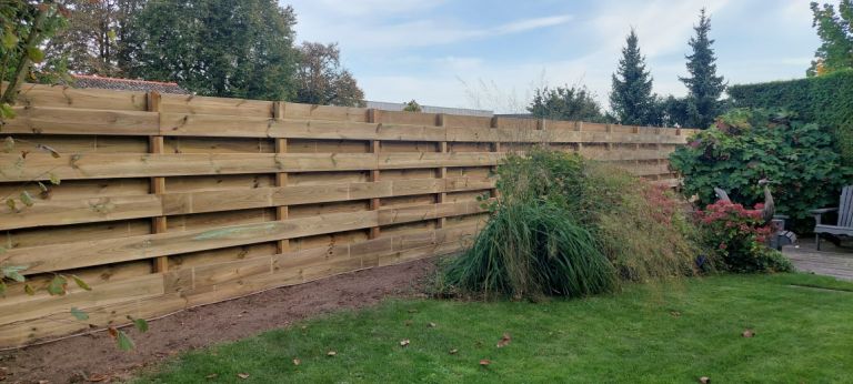 In opdracht van de klant hebben we een reeds bestaande tuinafscheiding met 30 meter verlengd. Vooraf hebben we een oude coniferenhaag die behoorlijk breed geworden was en veel ruimte van de tuin in beslag nam verwijderd. We hebben voor de afscheiding gebruikgemaakt van palen van 9x9cm met geimpregneerde planken met RVS schroeven.